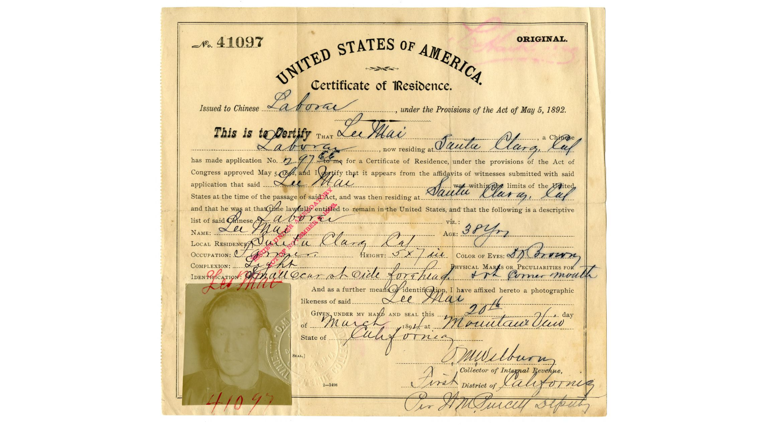 - This collection consists of seventeen Certificates of Residence. Under the provisions of the 1892 Geary Act, which amended the Chinese Exclusion Act of 1882, all Chinese in the United States were required to apply for, obtain, and carry a government-issued certificate of residence proving their legal presence in the United States. Chinese and Chinese Americans discovered without such identification could be arrested and deported. Create a dataset from the first three (or more) documents on this site: https://digitallibrary.californiahistoricalsociety.org/object/2625?solr_nav%5Bid%5D=0153503c8613a8d43d58&solr_nav%5Bpage%5D=0&solr_nav%5Boffset%5D=0 . Or see files here: